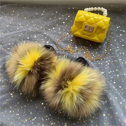 Ensemble tendance pour femmes avec fermeture ouverte Sandales Pantoufles Jelly Handbag Chaussures en fourrure de renard avec porte-monnaie Accessoires assortis